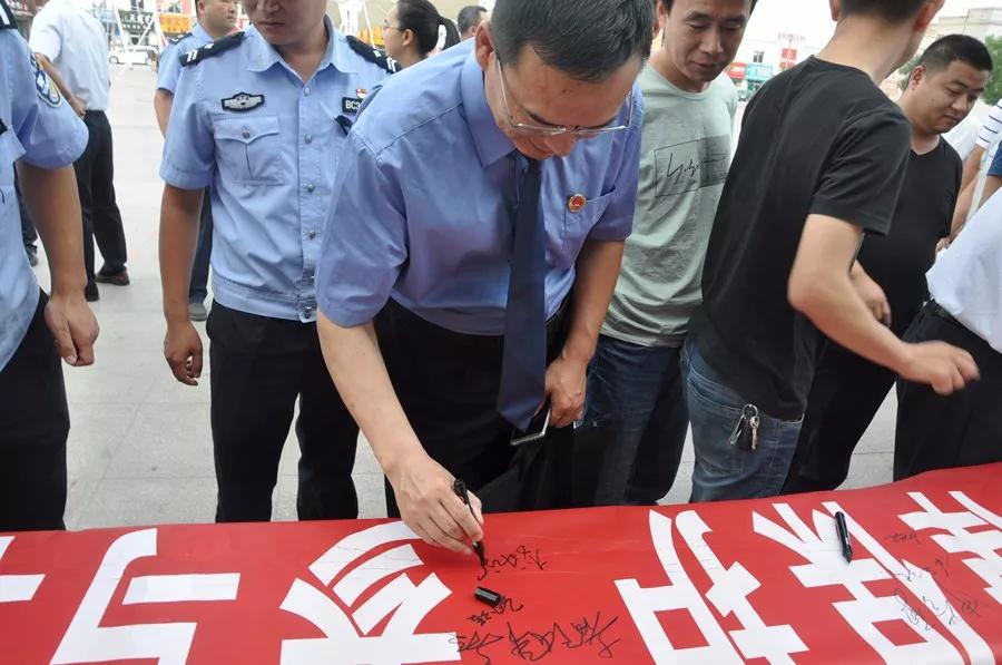 5月29日上午,滨城区检察院侦查监督科、派驻滨州工业园区检察室干警参加了滨城区防范和处置非法集资工作领导小组办公室组织的以“拒绝高利诱惑,远离非法集资”为主题的广场宣传活动,并在印有“非法集资不受法律保护,参与非法集资风险自担”字样的横幅上签名。