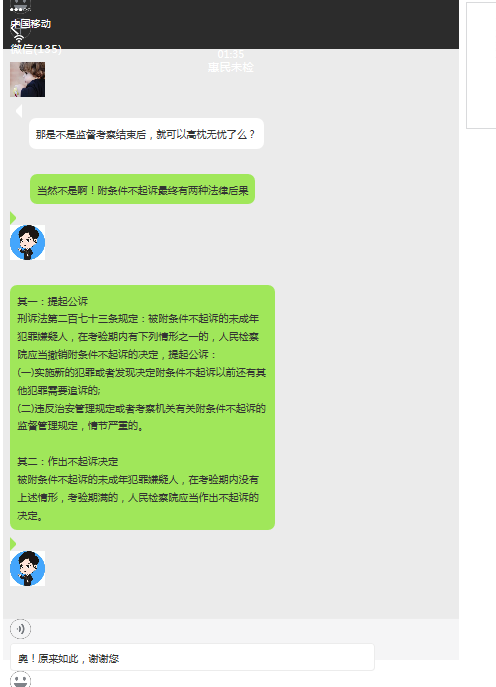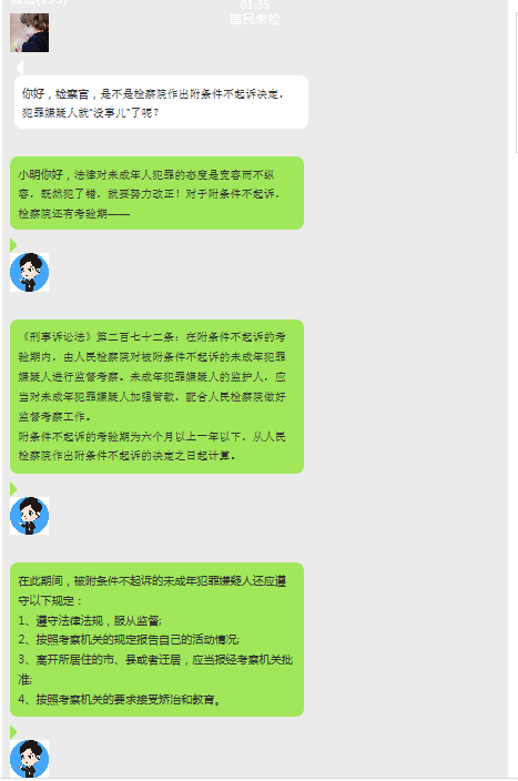 是不是检察院作出附条件不起诉决定,犯罪嫌疑人就“没事儿”了呢?看一下下面小明和检察官的对话你就更清楚了!