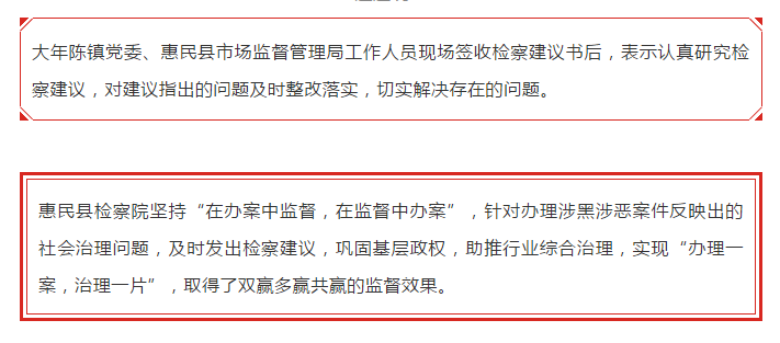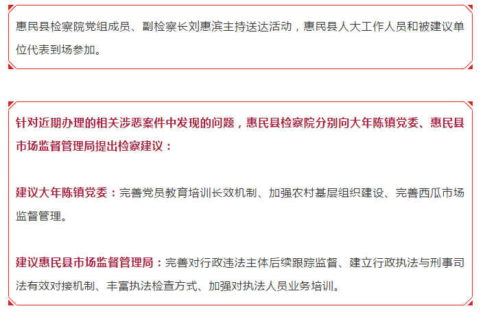 5月24日,针对在办理相关涉恶案件中发现的问题,惠民县检察院分别向大年陈镇党委、惠民县市场监督管理局公开送达检察建议书。